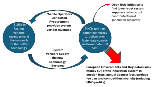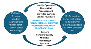 This massive order book in waiting galvanized vendors to invest heavily in R&D. Their investments were then paid back through the MNO procurement orders for new non backwards compatible 2G Radio Access Networks. This replenished the coffers of the vendors – who could press ahead with high research investments in the next generation of mobile innovation.