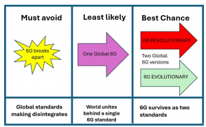 This leaves 6G poised between one of three outcomes as shown in figure 5. The worst outcome would be for the hitherto highly cohesive global mobile industry to break-up into many rival 6G blocks (China, USA, EU, India and S Korea to name but five). Nobody owns the 6G label, so each of the different rival industrial factions could all claim their technology is “the true 6G”. But fragmented standards would diminish scale economies and wreck global inter-operability.
